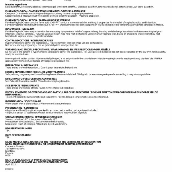 FulviAct FulviRex Vaginal Cream is a natural, Proudly South African solution for relieving the discomfort of vaginal candida infections (thrush). Formulated with CHD-FA, it soothes burning, itching, and discharge while maintaining a healthy pH balance and supporting natural vaginal flora. This gentle cream also helps prevent odours, keeping your intimate area fresh and comfortable. FulviRex is a reliable, natural choice for women seeking effective and soothing care.